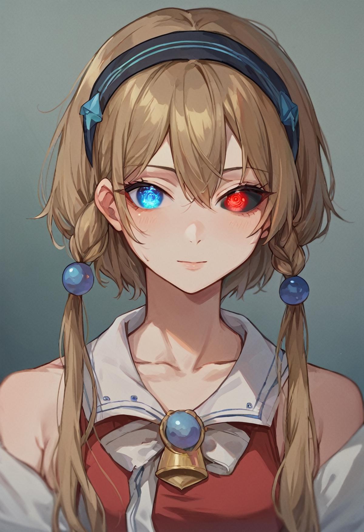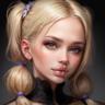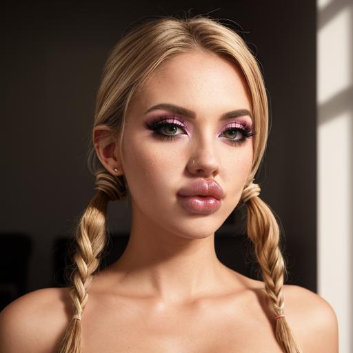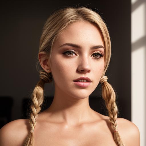 a woman, headshot, portrait, bimbo, blonde hair, pigtails, front view, (best quality, masterpiece, perfect face, detailed symmetric iris, perfect smooth skin texture), (hyper realism, soft light, dramatic light, sharp, HDR), <lora:more_details:0.5>