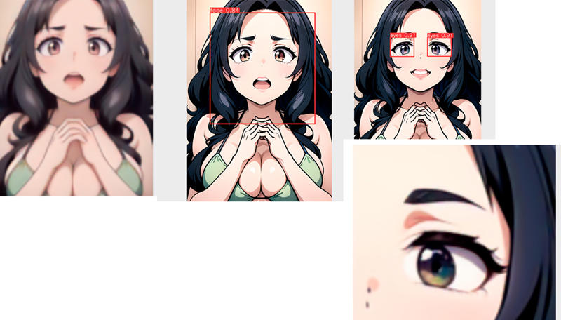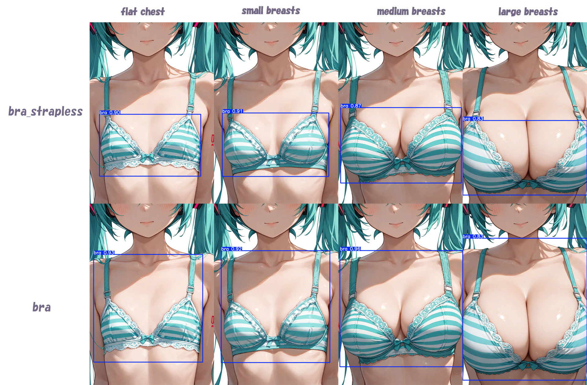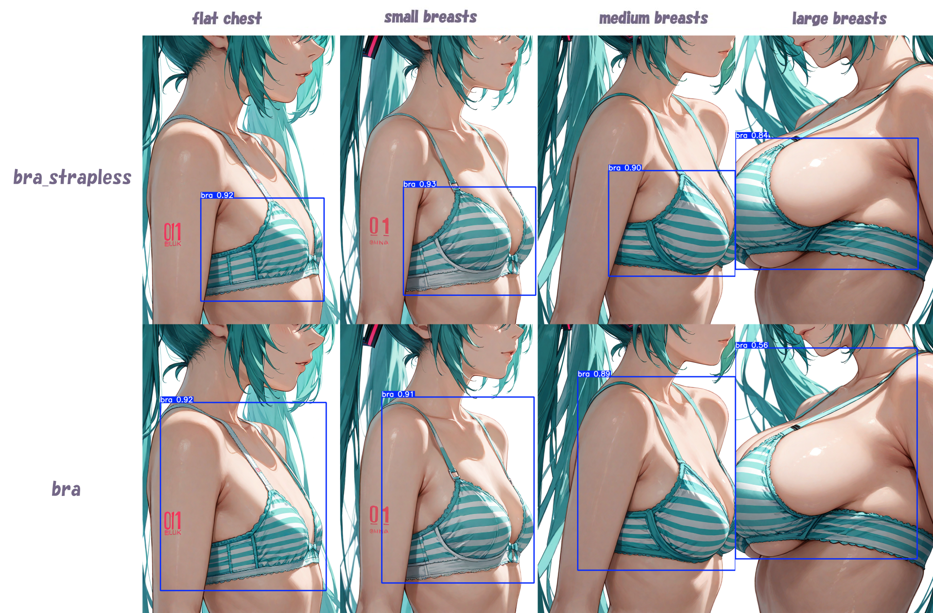 多分旧作より精度は高いですが、検出範囲が細かくなっていますので、旧作のような大き目の検出範囲が欲しい方は、Adetailerの機能を使って範囲を広げるか、旧作を使用してください。また、この画像が検出しない!などありましたら、Pnginfoを添えて画像をここにポストしていただければ、次回その情報を基にデータセットを作成するように心がけます。