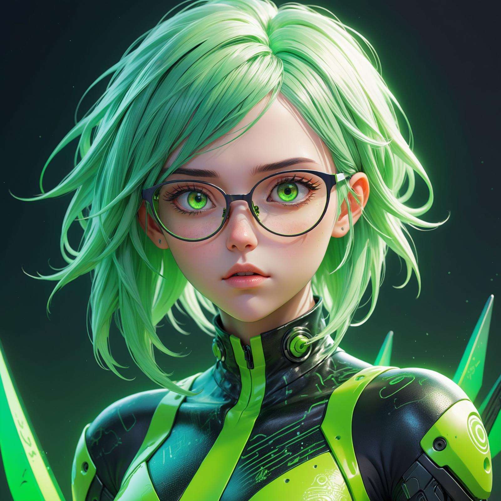 a woman with green hair and glasses,neon green bodysuit,upper body close up,looking straight at viewer,cgsociety cyberpunk,trending on artstatioin,stunning 3d render of a fairy,(3d render:1.3),charli bowater and artgeem,cyberpunk angry gorgeous goddess,imvu,2070s,breathtaking render,