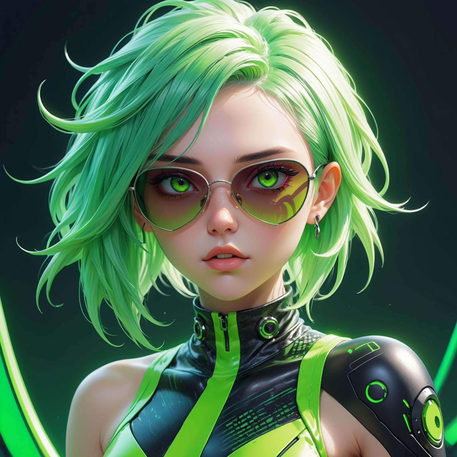 a woman with green hair and sunglasses,neon green bodysuit,upper body close up,looking straight at viewer,cgsociety cyberpunk,trending on artstatioin,stunning 3d render of a fairy,(3d render:1.3),charli bowater and artgeem,cyberpunk angry gorgeous goddess,imvu,2070s,breathtaking render,